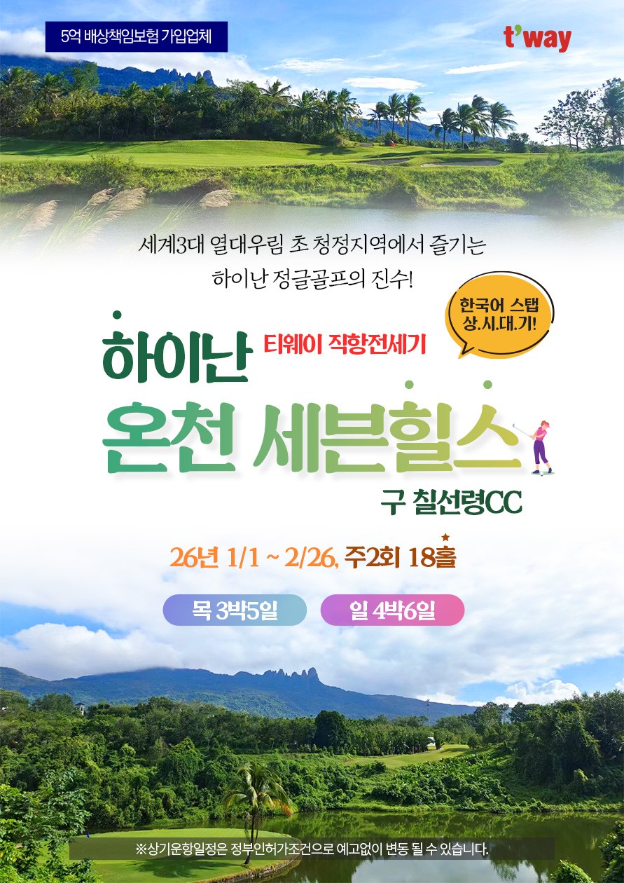 부산에서 하이난 싼야 직항 전세기로 칠선령 온천 하이난 중심부의 청정 산악지대, 칠선령 온천CC와 즐기는 이색 온천골프여행! 1년 내내 온화한 기후 평균 20~24℃, 겨울에도 라운딩 OK!