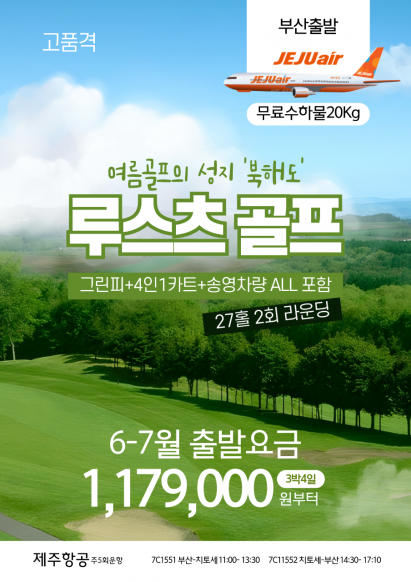 여름골프 성지 명품 루스츠G.C로 초대합니다. 제주항공 출발로, 고품격 루스츠CC 27홀*2회 6월~7월 최고의 날씨로 라운드를 즐겨보세요