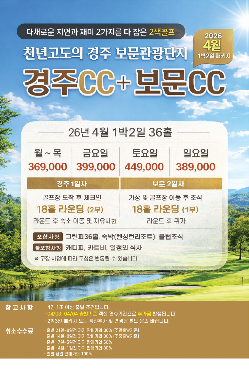 자연과 역사, 그리고 명문 코스가 어우러진 경주CC + 보문CC 1박 2일 골프투어입니다. 서로 다른 개성을 지닌 두 골프장에서 총 36홀의 여유로운 라운딩과 편안한 숙박까지 한 번에 즐겨보세요.