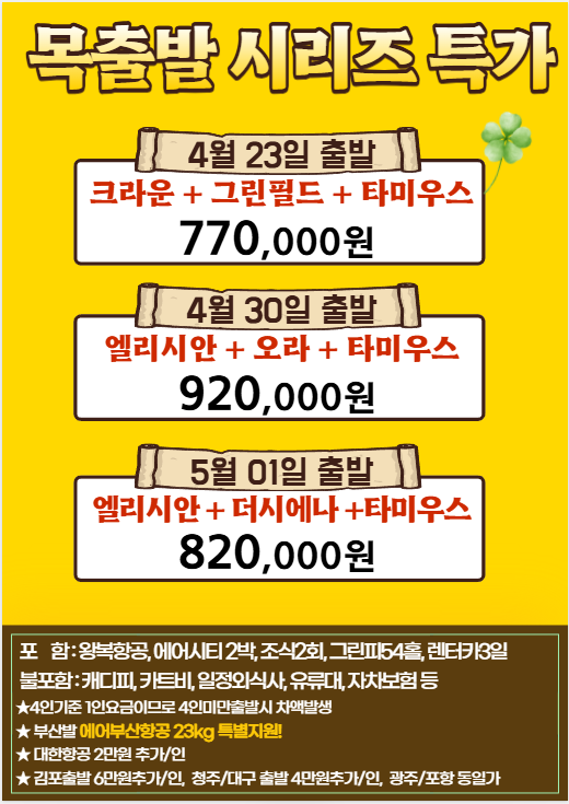 김포 출발 6만/인 추가, 청주/대구 출발 4만/인 추가, 광주/포항 출발 동일가