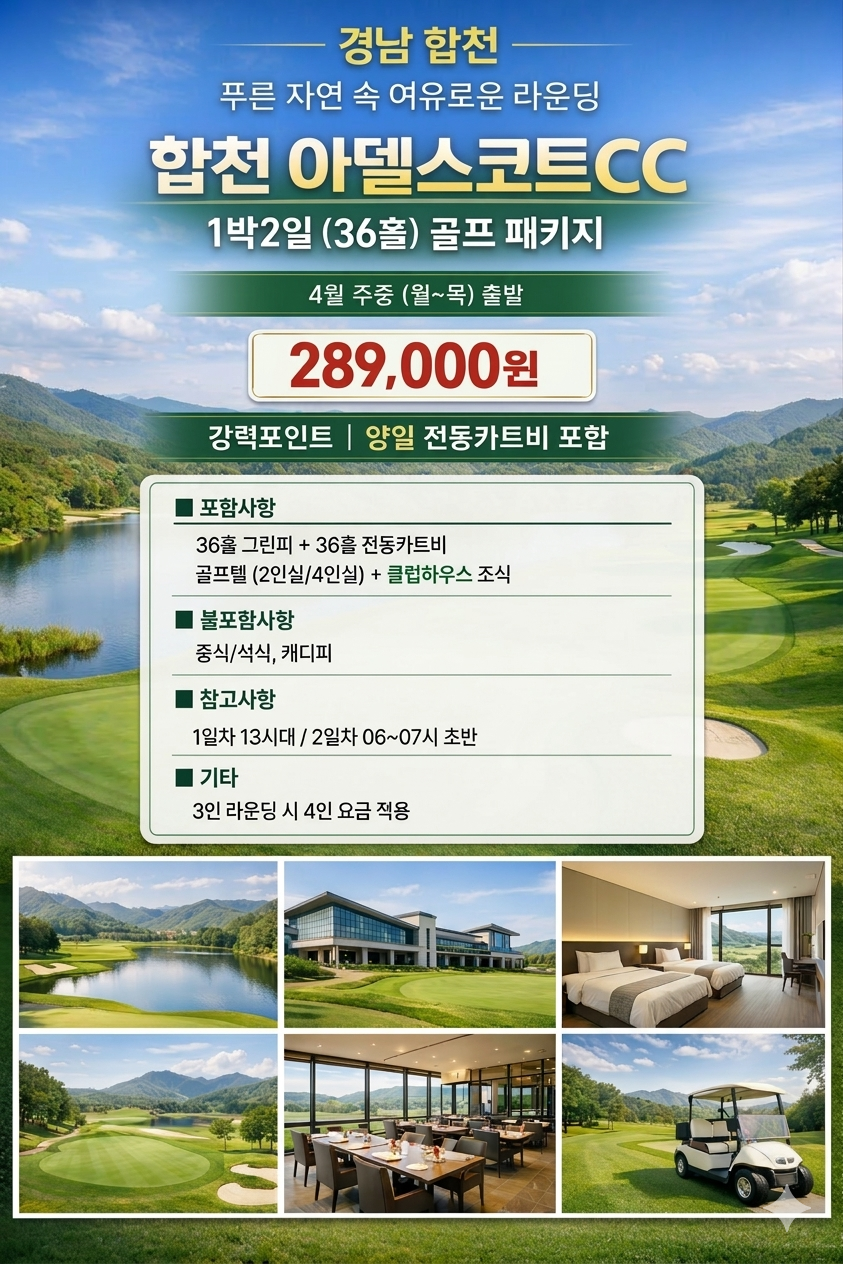[4월]합천 아델스코트CC 1박2일 패키지 289,000원(카포)