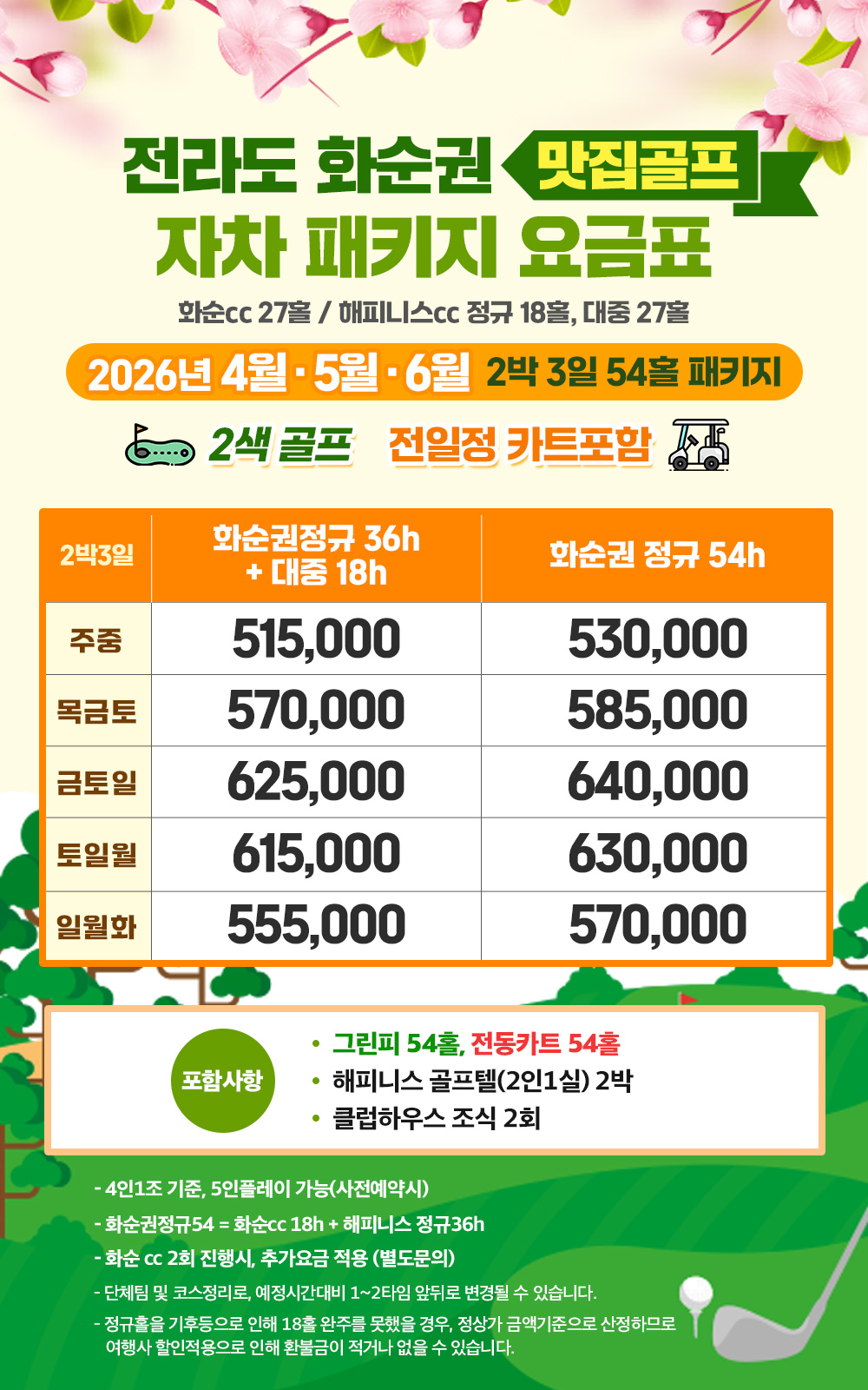 화순cc 27홀 / 해피니스cc 정규18홀, 대중27홀 / 함평 베르힐cc 27홀 전일정 카트포함 자차패키지