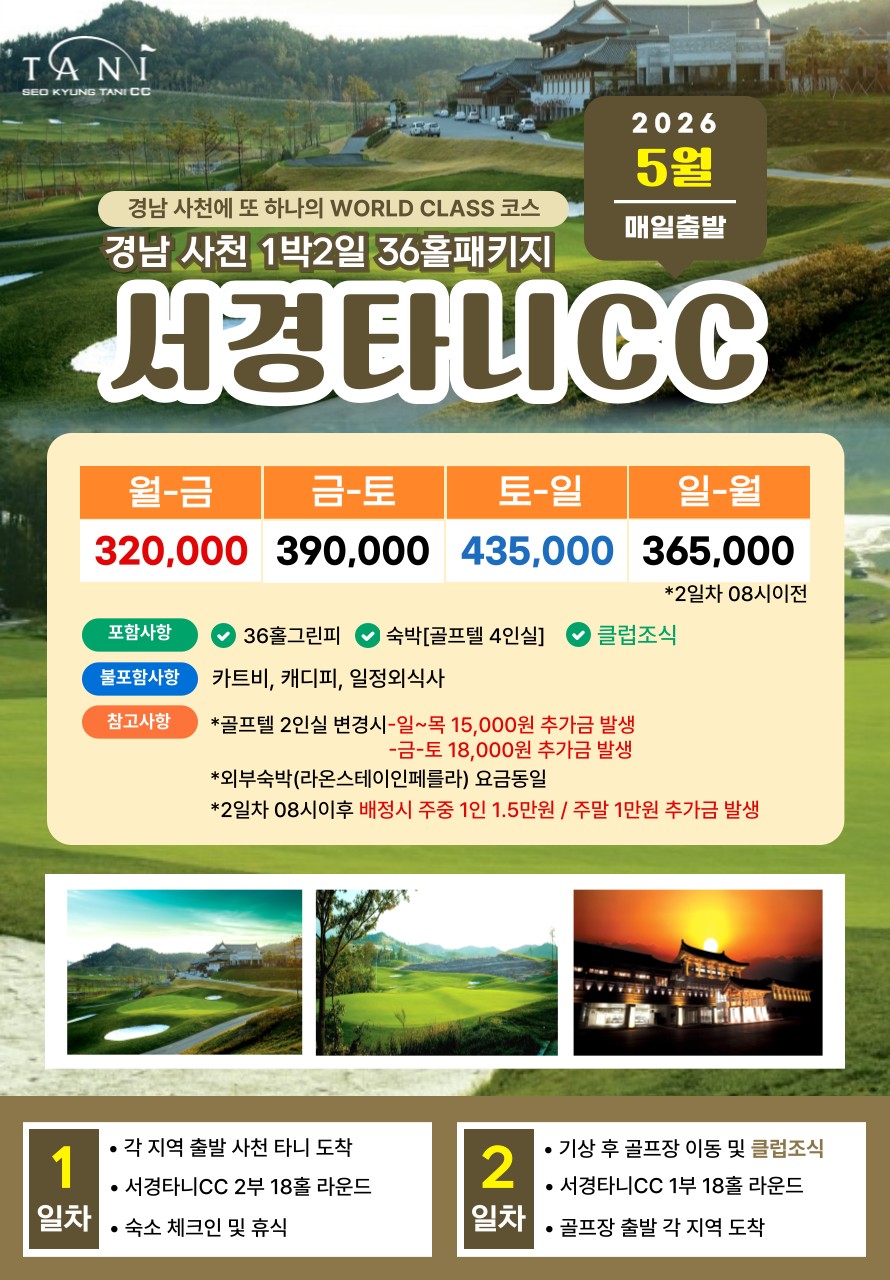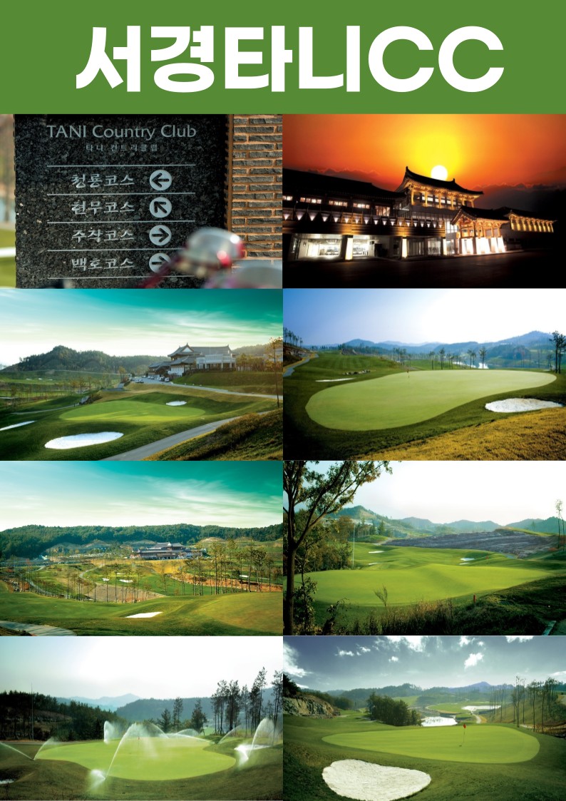 국제코스 규격을 갖춘 36홀의 도전적 코스, 서경 TANI 청룡/백호/주작/현무 36홀 대중제 골프장금거북이 물 속으로 들어가는 형상으로서 富와 長壽의 기운이 넘치는 金龜入水形의 명당 라운드의 묘미를 더해주는 자연림과 남강 조망, 균형과 비대칭의 조화를 고려한 코스 레이아웃