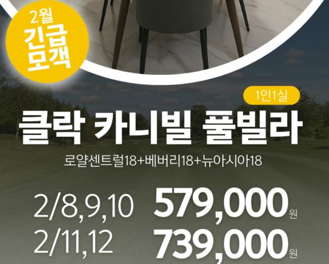 부산-클락 26년 2월 긴급 모객 상품으로 클락 카니발 풀빌라 상품 올려드립니다. 골프장은 매일 다른 로얄센트럴CC, 베버리CC, 뉴아시아CC 3색골프로 진행입니다.