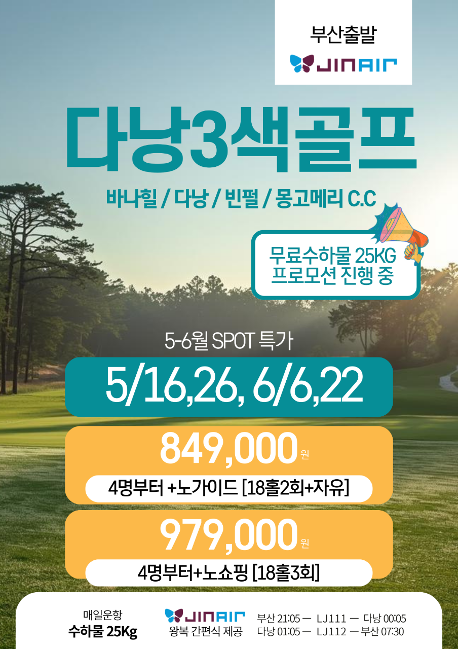 골퍼 수하물 20 => 25KG 업그레이드 빈펄 / 바나힐 / 다낭 / 몽고메리 C.C 준특급 호텔 2인 1실 숙박 4인부터 출발 확정