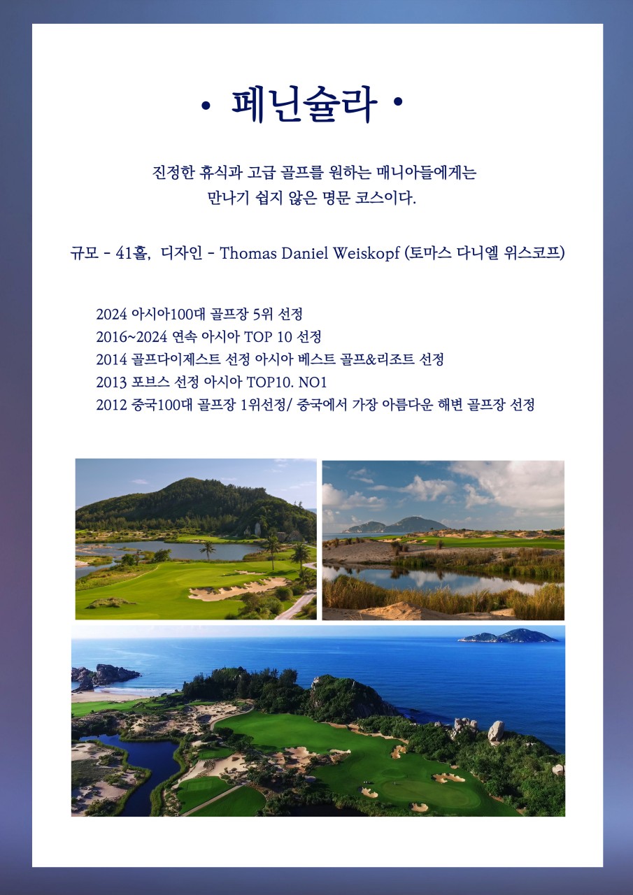 아시아 최고의 골프장으로 10년간 한국 골퍼들에게 사랑 받아온 하이난 신주 페닌슐라 골프 코스가 다시 아시아 TOP10에 진입 한국 골퍼 60명에게 그린피 면제 서비스 실시!!