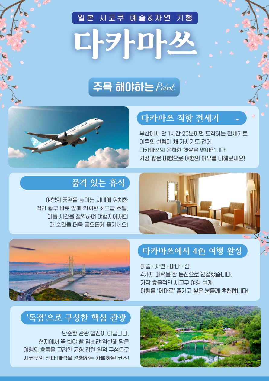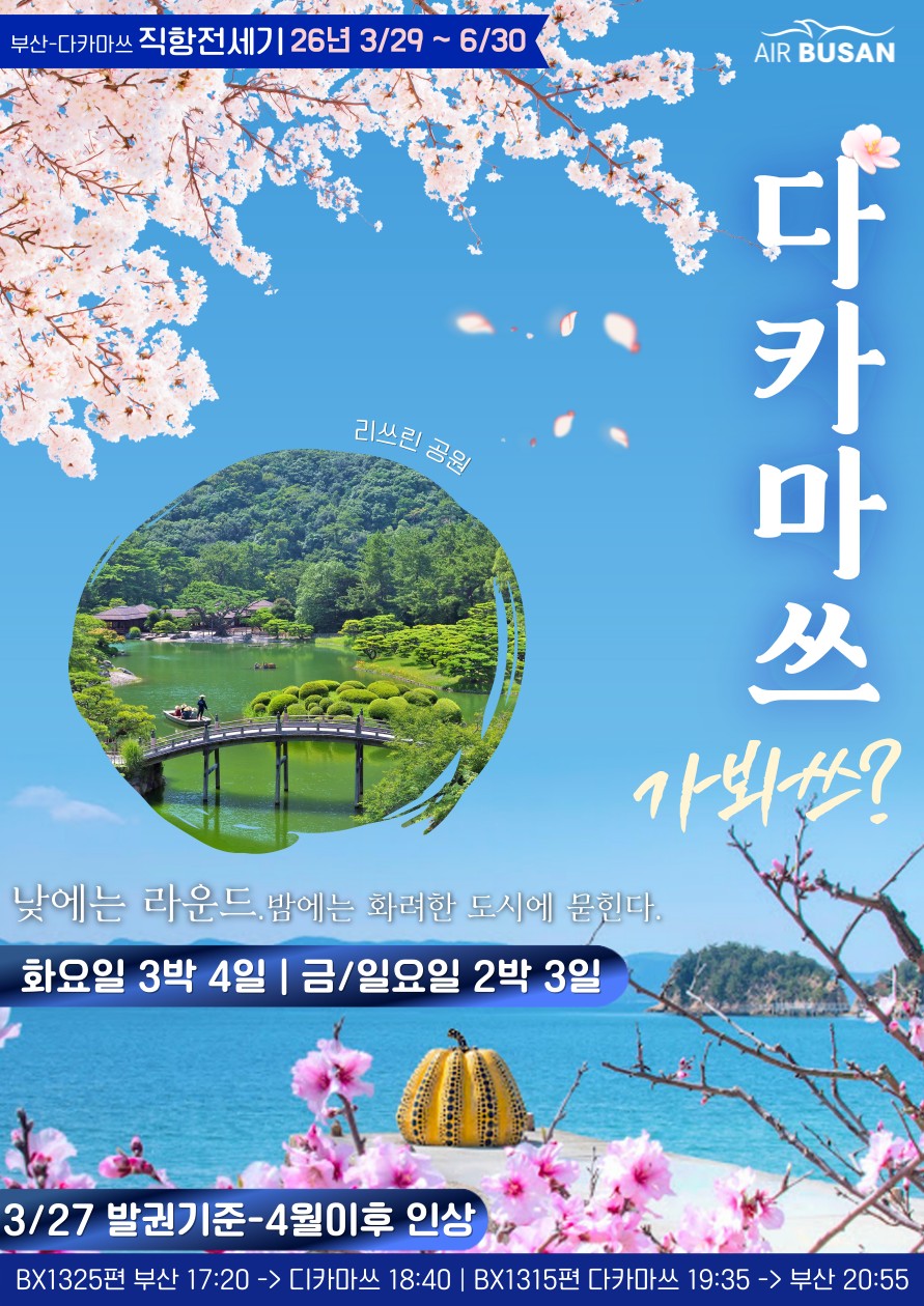 사람과 예술이 만나는 도시 “다카마쓰”, 부산-다카마쓰, 신규 취항!!” GRAND Launching. “런칭 프로모션 특별가 할인" 낮에는 라운드 밤에는 화려한 도시에 묻힌다. “사누키 우동”의 본고장 세토내해의 조용하고 화려한 예술의 도시로 특별초대