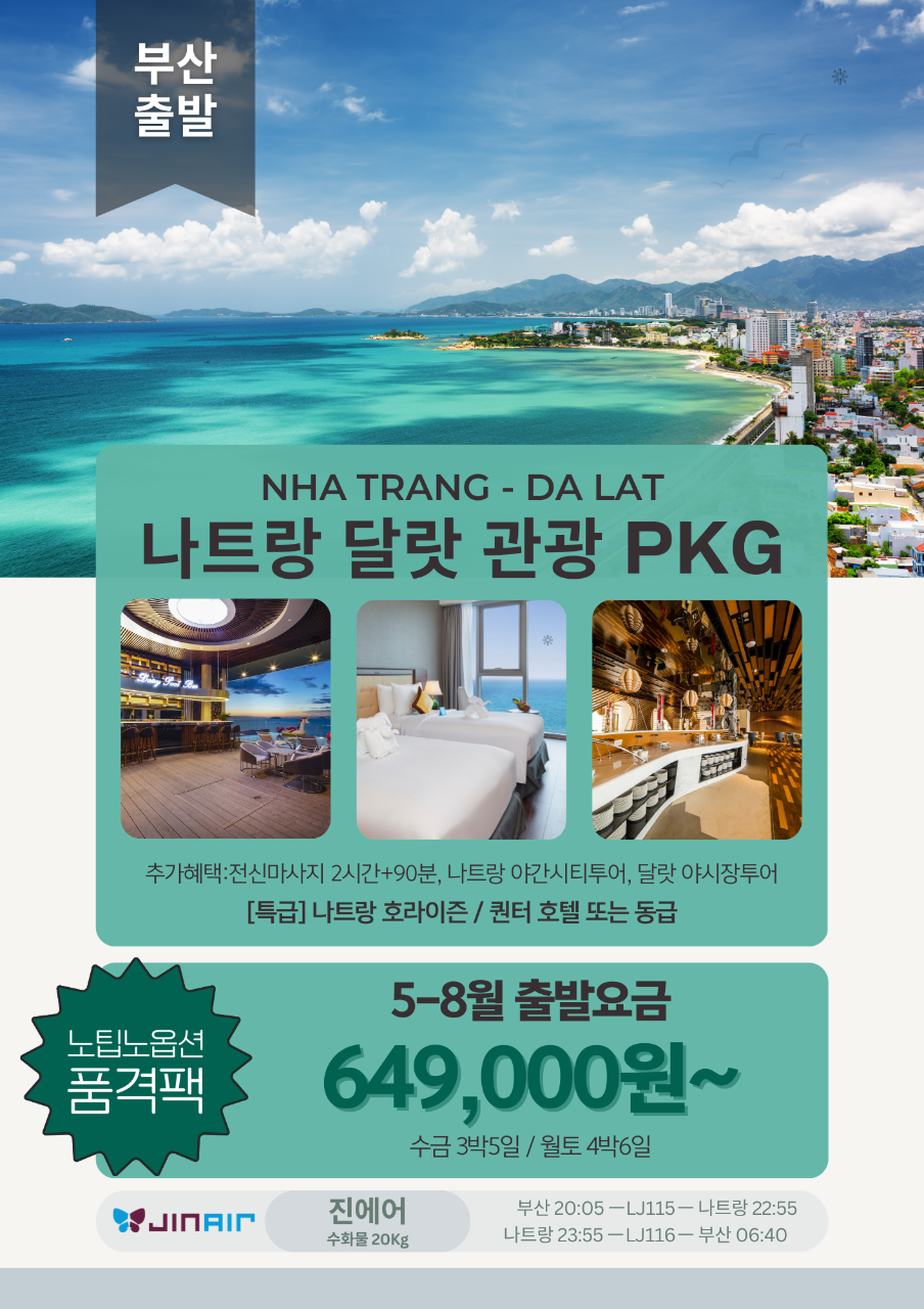 진에어 항공 4/29~ 재취항) 수금 3박5일, 월토 4박6일 여정 베트남 떠오르는 휴양지 나트랑에서 달랏 필수 투어지등 한번에 만나는 꽉찬 패키지!! 가족 휴양지 강추지역 입니다