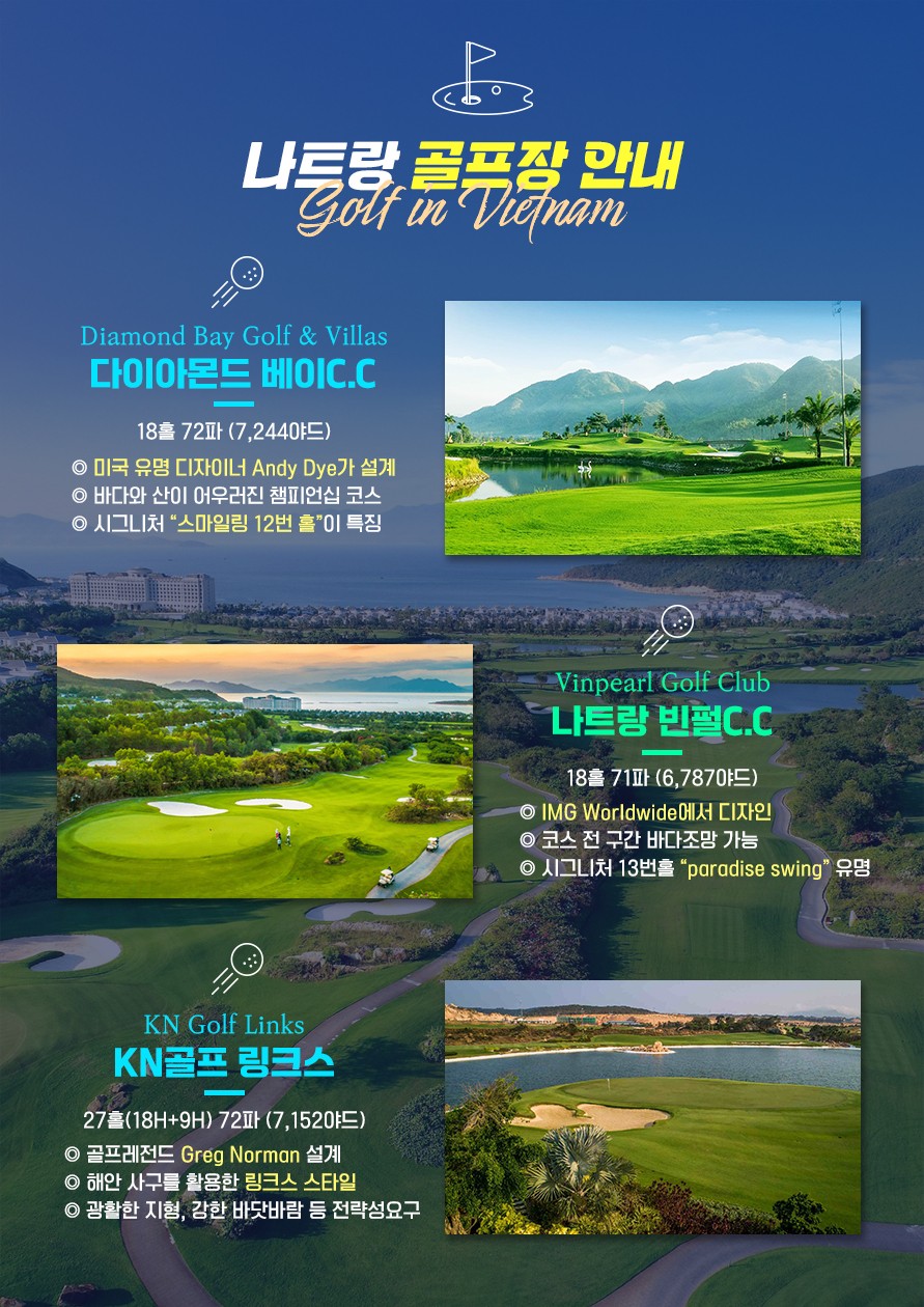 ⛳다이아몬드CC--장엄한 산과 코스내의 아름다운 조경, 페어웨이 및 그린이 다이나믹하게 설계,⛳빈펄CC -모든 홀에서 바다의 멋진 전망을 즐기시며 라운딩 가능,⛳KN골프 링크스 -그렉노먼이 디자인한 베트남 10대 골프장